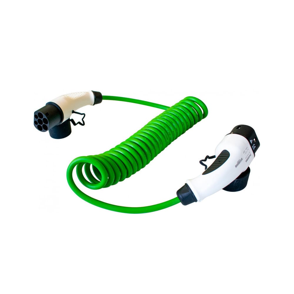Cablu de incarcare pentru masinile electrice de la Type 2 la Type 2, 7KW, 32A monofazat. Cablul spiralat are o lungime maxima de 5 m de culoare verde.