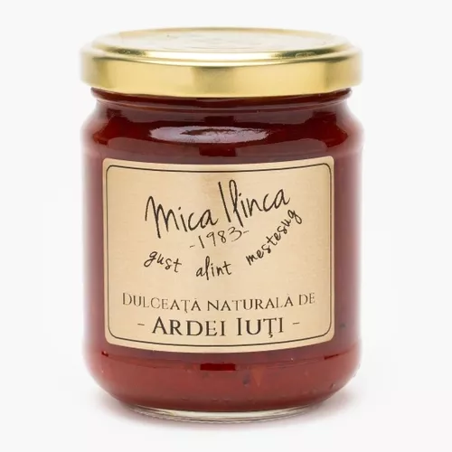 Dulceață Naturală de Ardei Iuți, 220g | Mica Ilinca Un produs, gustos și savuros făcut pe cuptoare ce funcționează cu lemne, din legume atent selecțioante. Produs fără conservanți, fără E-uri, fără coloranți, fără aditivi alimentari, pentru a păstra aroma neschimbată. Beneficii ardei iuți Pot reduce în mod eficient durerea cauzată de artrită, psoriazis şi neuropatia diabetică Ajută în procesul de slăbire Întăresc imunitatea Îmbunătățesc digestia Ingrediente Ardei iuți, ardei kapia, oțet, zahăr, sare. Fără E-uri | Fără conservați | Fără coloranți | Fără aditivi alimentari Conținut caloric pentru 100 g Energie (kcal) 267.4 Grasimi (grame) 0.1 Carbohidrati/ Glucide (grame) 65.49 Proteine 1.15 Sare / Sodium 0.1 Mod de păstrare, recomandări A se păstra la loc uscat și răcoros, ferit de razele soarelui și de îngheț. Temperatura recomandată de păstrare: 5-20 grade Celsius. A se consuma până la data înscripționată pe ambalaj. După deschidere a se păstra la frigider și a se consuma în termen de 10 zile. Țară de proveniență: România Gramaj 220g Producător Mica Ilinca