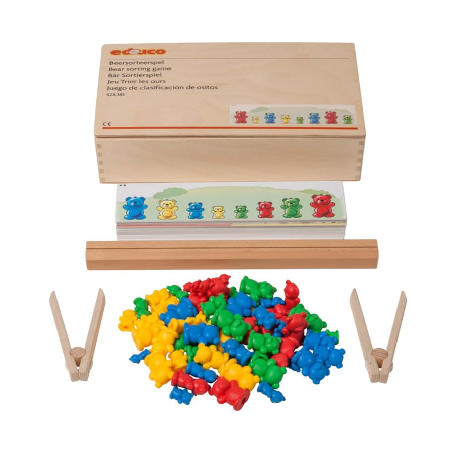 Sortați urșii cu aceeași culoare și dimensiune în fața cardului cu activități utilizând o pensetă.Setul conține: 16 carduri cu activități, 64 urși, 2 pensete din lemn, 2 suporturi din lemn și o cutie din lemn (32 x 18 x 6 cm).