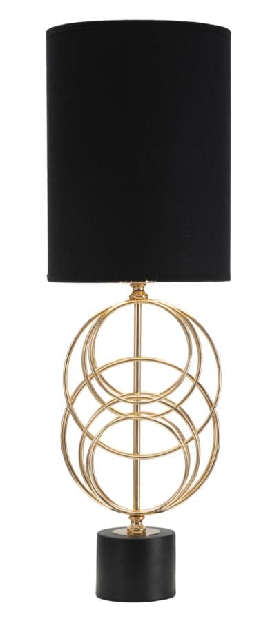 Lampa de masa eleganta in stil glam, din metal auriu si abajur din material negru. Decoratiile metalice concentrice dau o nota de unicitate oricarui tip de mobilier.