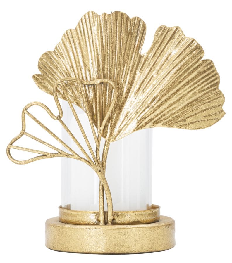 Suport elegant pentru lumanari din metal auriu si sticla cu frunze cu un design deosebit pentru a aduce o nota de prospetime in orice camera.