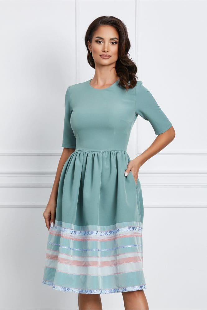 Specificații: Rochie Anda verde mint cu broderie si imprimeu la baza
