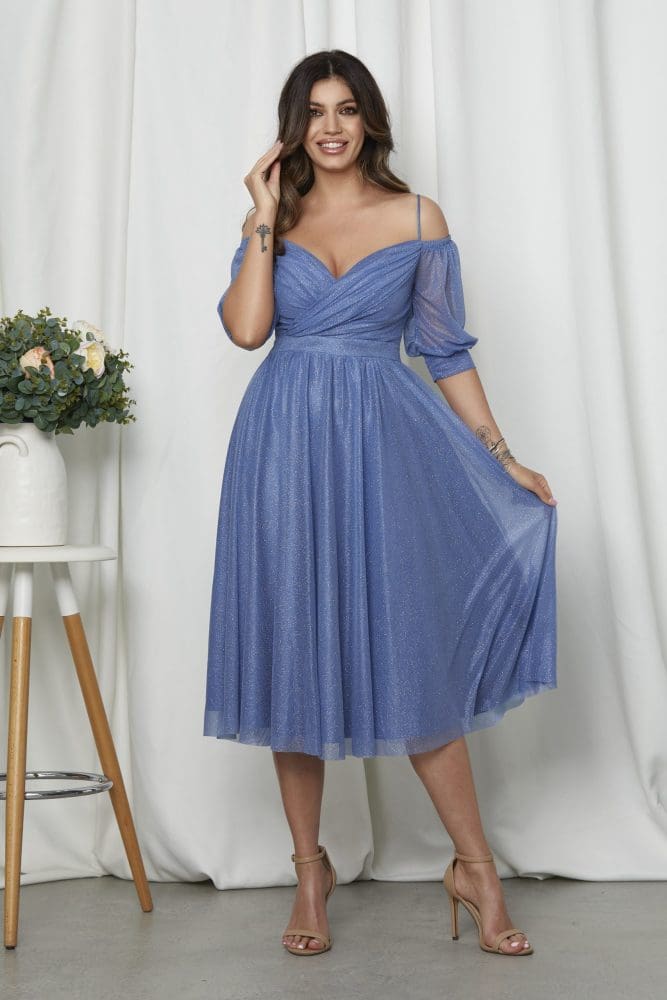Rochie de ocazie midi lila din voal cu glitter, ideala pentru seri deosebite unde sigur vei iesi in evidenta. Forma baby doll precum si design-ul special, vor face din aparitia ta, una cel putin spectaculoasa. material usor elastic bust buretat fermoar ascuns la spate decolteu in V petrecut maneci trei sferturi lasate bretele subtiri nedetasabile voal cu sclipici jupon din lycra Dimensiuni disponibile: S, M, L, XL