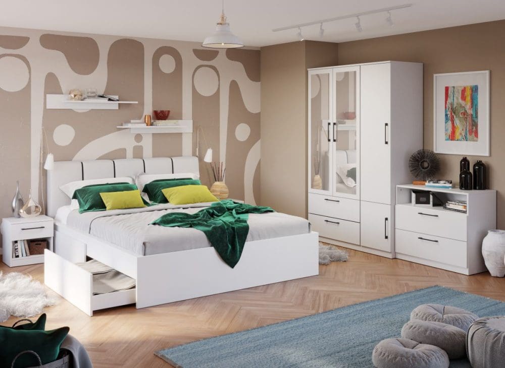 Set Dormitor Snow C22 tapitat / oglinda Un dormitor matrimonial versatil ce doreste sa bifeze toate cerintele unui mobilier ideal. Set Dormitor Snow C22 tapitat / oglinda are un aspect modern, combinand palul alb cu manerele negre, ce mentine linii drepte si clare in design. Dulapul are dimensiuni generoase, este spatios, iar inaltimea este conceputa cat sa incapa si in camere mai putin inalte sau in mansarde. Pe langa dulap, comoda, noptierele si patul ofera la randul lor spatii de depozitarea prin sertare . Deasemenea puteti alege seturi cu pat cu dimensiuni de 140, 160, 180×200. Aveti posibilitatea de a adauga doua sau patru lazi de depozitare. Corpuri Set Dormitor Snow C22 tapitat / oglinda Dulap 41cm cu usi – L 41 x A 48 x H 192.5cm – Schita Montaj Compartimentat cu 4 polite. Dulap 83cm cu sertare – L 83 x A 48 x H 192.5cm – Schita Montaj Compartimentat cu 2 polite, bara umerase, 2 sertare (nu sunt prezentate sertarele in randarea de compartimentare dulap, insa sertarele sunt incluse ) Pat matrimonial – L 151.4, 171.4, 191.4 x A 211 x H 95cm – Schita Montaj Suport de saltea inclus. Sustine pana la 300kg. Set sertare/lada pat (optional) – L 103 x A 69.4 x H 28.7cm – Schita Montaj Poti alege 2 sau 4 sertare/lazi pentru depozitare Set noptiere – L 39 x A 30.4 x H 41.5cm – Schita Montaj Cu sertare si spatiu generos. Comoda – L 83 x A 42.3 x H 71.7cm – Schita Montaj Spatiu depozitare deschis si doua sertare. Set polite albe suspendate (optional) – L 92 x A 16.1 x H 14.5 cm – Schita Montaj Livrare Gratuita prin flota proprie Suntem producatori de mobilier Toate corpurile au o garantie de 2 ani Pat Alb Set Dormitor Snow C22 tapitat / oglinda Tapiterie Alba cu insertii negre din piele ecologica. Se pot pune 2 sau 4 sertare de depozitare. Este rezistent cu sustinere in mai multe elemente: puncte de sprijin pe doua axe, 2 linii de sustinere pe lungime/laterale + 1 T central, L-uri metalice pe colturi Dimensiuni Pat Alb Latime: 151.4 cm sau 171.4 cm sau 191.4 cm (la alegere) Adancime: 211 cm Inaltime capat mare: 95 cm Inaltime capat mic: 36.8 cm Spatiu incadrament saltea: 7 cm (cat intra salteaua in cadru) Spatiu de la suport saltea la pardoseala: 30.5 cm Suportul de saltea din pal brut este inclus in pret. Saltea Compatibila 180×200 cm, 160×200 cm sau 140×200 cm in functie de dimensiunea de pat aleasa. Salteaua nu este inclusa! Bifati sus ca doriti. Alege 2 sau 4 lazi pentru depozitare Sporeste utilitatea patului prin lazile de depozitare. Reperul de jos este din pal de 16mm ce ofera o rezistenta sporita. Nu necesita fixarea pe cadrul patului, sunt pe roti si culiseaza sub pat iar frontul sertarului se opreste in laterala patului mascand spatiul de sub pat. Pot fi puse pana la 4 sertare. Dimensiune 1 sertar: 28.7 cm x 103 cm x 69.4 cm. Set Dormitor Snow C22 tapitat / oglinda Face parte din familia de mobila pentru dormitor Snow . O solutie ideala pentru un dormitor matrimonial. Corpurile din Set Dormitor Snow C22 tapitat / oglinda sunt realizate din PAL melaminat cu finisaj Alb care creeaza un spatiu rafinat si un ambient placut. Cantul aplicat este unul de 0,6 ce le permite muchiilor sa fie placute la atingere fiind finisate si atent retusate. Pretul afisat nu include alte accesorii sau obiecte de decor (tablouri, elemente de iluminat, asternuturi, covor etc.) Produsul se livreaza demontat si este insotit de accesorii si instructiuni de asamblare. Dimensiunile sunt exprimate in cm si pot oscila intre ± 10 mm.