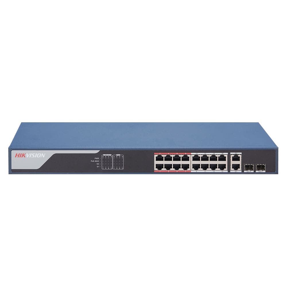 DS-3E1318P-EI este un switch cu 16 porturi, de la Hikvision. Acest switch este unul gestionat, putand oferi o gestionare si intretinere usoara. Poti implementa, monitoriza si extinde cu usurinta sistemul de supraveghere oricand si oriunde cu ajutorul platformelor noastre software. Poti vizualiza topologia retelei, monitoriza starea acesteia si poti primi alarme de tip push in timp real, ceea ce reduce foarte mult costul operatiunii si intretinerii retelei. Dispune de protectie impotriva descarcarilor electrice de pana la 6 kV pentru porturile PoE. Capacitatea de comutare este de 7.2 Gbps, rata de transfer a pachetelor de date este de 5.3568 Mpps, iar dimensiunea tabelei de adese MAC ajunge la 16000 de intrari. Alimentarea se va face la 100~240 VAC, 50/60Hz, Max. 2.5 A, iar temperatura optima de functionare este cuprinsa in intervalul -10°C si +55°C.