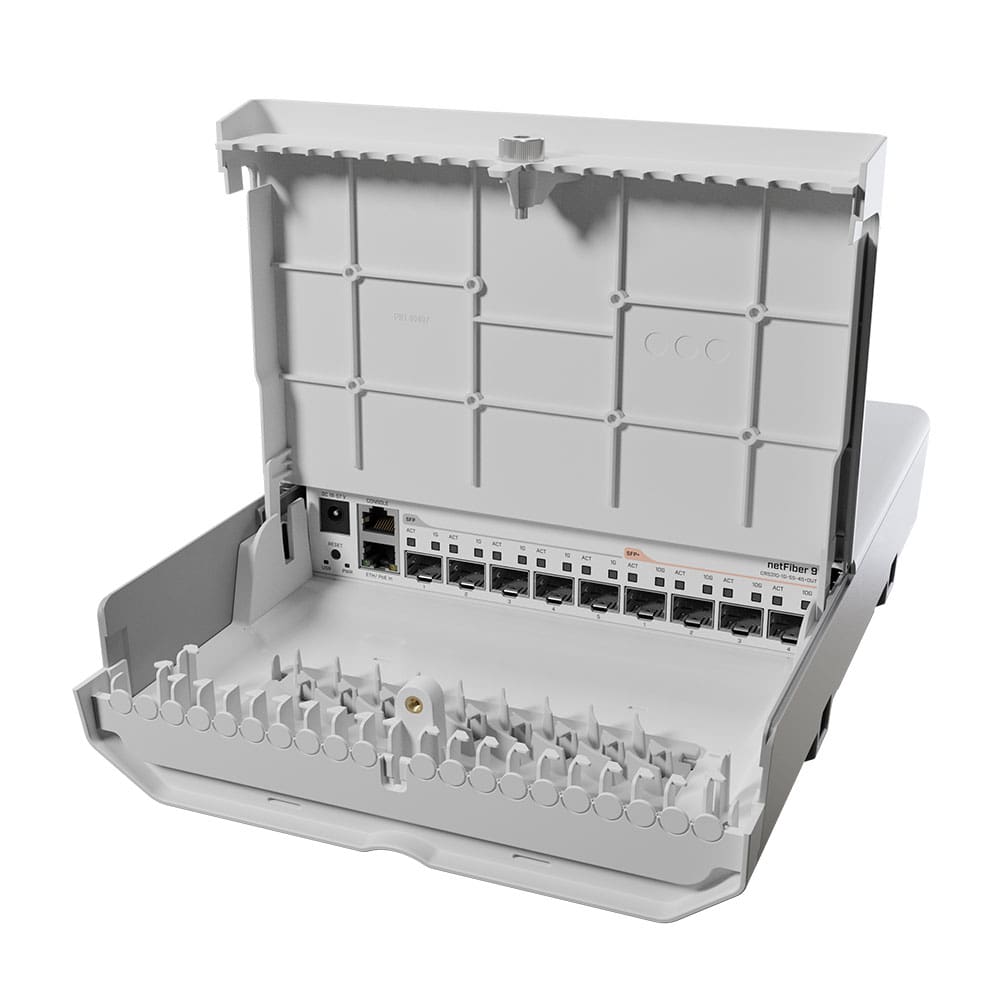 CRS310-1G-5S-4S+OUT este un switch pentru exterior Gigabit, de la MikroTik. netFiber 9 este un switch puternic pentru exterior cu SFP, SFP+ si Gigabit Ethernet. Dispune de un procesor ARM v7 puternic, 256 MB RAM, 4 porturi 10G SFP+ si un switch-cip Marvell avansat care poate face fata chiar si celor mai grele sarcini. Portul Gigabit Ethernet nu este doar pentru scopuri de management. Are o conexiune directa la cipul comutator astfel incat sa te poti bucura de viteza Gigabit la capacitate maxima. Acest port accepta si PoE-in, astfel incat sa ai o alternativa pentru alimentare pe langa mufa DC pentru alimentarea in locuri inguste si greu accesibile. De asemenea, switch-ul dispune de 1 port consola RJ45, 5 porturi SFP obisnuite si 4 porturi SFP+ pentru reteaua de 10 Gbps. Aceasta inseamna ca ar putea fi destul de multe fire pe care sa le organizezi la un moment dat. De aceea, carcasa a fost proiectata pentru a avea cateva caracteristici suplimentare la indemana in partea de jos, pentru a pastra toate cablurile in ordine. Carcasa robusta ofera o protectie decenta in mediile cu praf, cu stropi ocazional de apa. Dispune de un radiator pe spate care serveste doua scopuri. Nu numai ca ofera o disipare remarcabila a caldurii, ci si misca centrul de masa spre lateral cu toate optiunile de montare mentinand placa ferma si puternica la instalare. Pachetul include cleme metalice pentru furtun si suruburi, astfel incat sa poti atasa netFiber la un stalp sau perete imediat. netFiber 9 este un instrument uimitor pentru oricine lucreaza cu conexiuni de peste 100 de metri, mentinand in acelasi timp pierderea de date si ping-ul scazut. Fibra optica poate fi o alternativa excelenta la cupru daca te ingrijoreaza interferentele electromagnetice sau poate chiar manipularea si interceptarea. Gradul de protectie este garantat de standardul IP54, alimentarea se va face la 18-57V DC/PoE, iar temperatura optima de functionare este cuprinsa in intervalul -40°C si +70°C.
